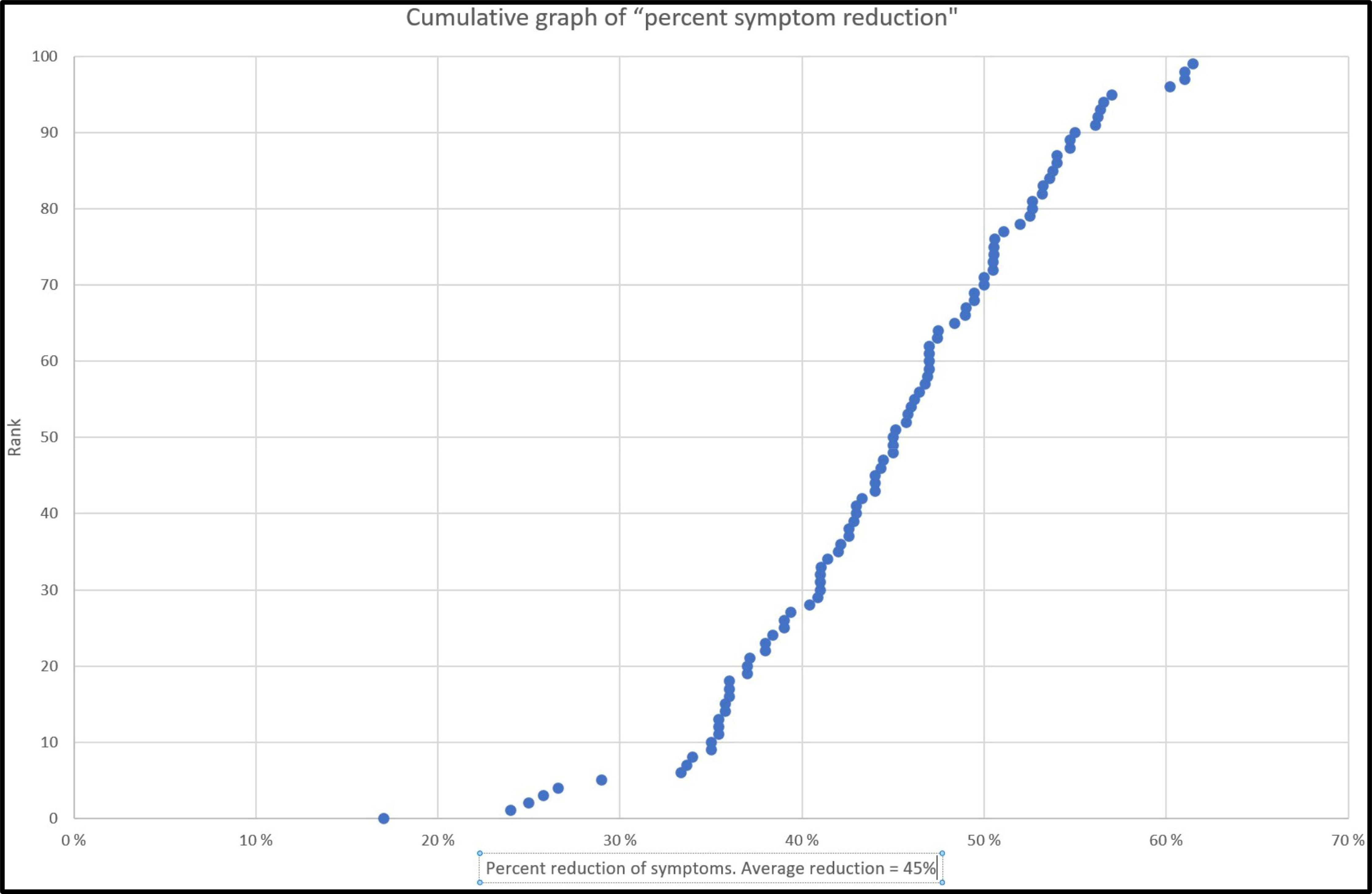 Rank-ordered plot of percent symptom reduction for the 10 most severe problem areas. The salient data shows the distribution in relative improvement. Each dot represents one individual. The median improvement in score was 45%, and 90% improved by 35% or more.