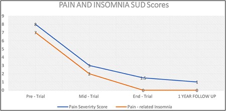 Symptom severity is indicated for the Pre-training, mid-training, and end of training status (20 sessions), as well as for one-year follow-up. Both pain intensity and pain-related insomnia resolved.